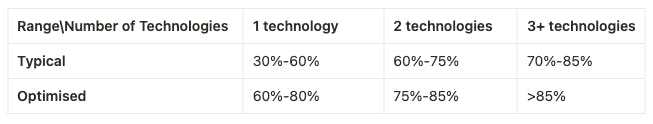 In terms of the diversity of technologies used, the rule of thumb is that the more different types of technology used, the better. For example, while solar by itself does not provide a great matching score, often sitting below 40%, pairing it with some wind generation can quickly increase the matching score beyond the 65% mark, with scores above 70% achievable under the right circumstances. You can use the table below to get an impression of the scores you could expect depending on the number of technologies used, but this of course depends which technologies are used as well. A portfolio with just 2 technologies, such as baseload geothermal energy complemented by some dispatchable hydro, could hit 100% matching, but this is sadly quite an uncommon mix.