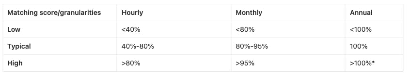 - Generally matching scores decrease when the level of detail increases: scores of 100% matching are typical at an annual level, scores between 80% and 95% would be typical at a monthly level, and between 40% and 80% would be in the normal range for hourly matching.